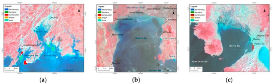 Sea reclamation in bays. (a) Qinzhou Bay; (b) Bangkok Bay; (c) Manila Bay.