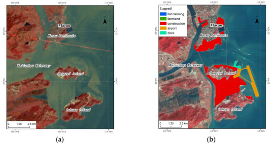 The Pearl River Delta is located along the sea in the central part of Guangdong Province (Figure 6). As a large tropical estuarine delta, the Pearl River Delta has abundant bifurcate rivers, and many entrances and shallows, and is easy for sea reclamation. Meanwhile, vast land area, a convenient water system, and the large trade port of Guangdong as the hinterland, leads the Pearl River Delta as the key area of China’s economic development. Since the reform and opening up in the 1970s, as the gateway in the South China region opening to the Southeast Asia area, the economy of the Pearl River Delta has developed rapidly and the demand for the sea has increased as well. Sea reclamation in the region (Huangmao Sea to the west and east to Daya Bay) covered a total area of 558 km2, more than 50% of the total reclamation area in China. From the land-use types, sea reclamation for fish farming dominated and the area reached 309 km2. Sea reclamation for construction followed, covering 164 km2. The areas of sea reclamation for docks and farmland were 44 and 30 km2, respectively. From the distribution, the largest-scale works occurred in Zhuhai, followed by Shenzhen and Jiangmen. In Gaolan Island, Sanzao Island, and Hengqin Island, in Zhuhai, sea reclamation works filled in the sea which connected the continent and islands.