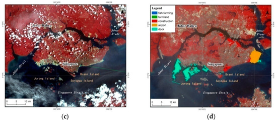 Sea reclamation of offshore islands. (a) Macau in 1975. (b) Macau in 2010. (c) Singapore in 1975. (d) Singapore in 2010.