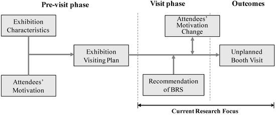 According to previous studies, to be effective, unplanned behaviour in tourism [16] or other related businesses such as conventions must be structured to provide unique value through reactions to stimuli based on instant information from a BRS. Online Recommender services via devices are a common form of personalisation and a persuasive communication tool for users to achieve their goals [28]. During consumer decision-making, Recommender services assist individuals in finding information on products or services. There is a perceived gap between consumers’ expectations and the disconfirmation of these expectations, which may provide an unpredictable or positive situation with the use of a BRS. Unplanned behaviour theory can be applied to exhibition contexts in which a BRS is used to manage the relationship between motivation and outcomes rather than the intentions of planned behaviour, as shown in Figure 1. The recommendation of a BRS functions as a trigger to unplanned booth visit behaviour in exhibitions when attendees’ planned visiting is not fulfilling their expectation during their visit phase. Due to attendees tending to use the purchase environment as a directory from which they access the necessary information at the moment of purchase [15,29], attendees seem to be influenced by the recommendation of a BRS at the moment of visiting.