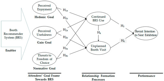 Impulse buying is defined as unplanned purchasing [17]. The psychological literature suggests that when people are in good moods, they are more likely to engage in approach behaviour. Thus, impulse buying is strongly influenced by the positive effect of good moods, including amusement, delight, enthusiasm, and joy. Beatty and Ferrell [17] found that impulse buying influenced shopping enjoyment. Thus, we propose that hedonic goals are positively involved in continued BRS use and unplanned booth visits in the context of exhibitions. Thus, we hypothesise the following: