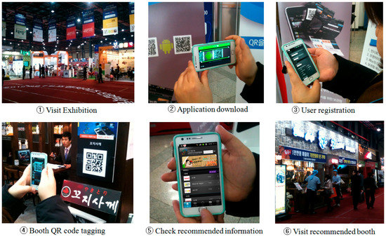 The major purpose of this study was to examine attendees’ perceptions of BRS for exhibitions. The BRS has been developed for mobile communication technology and uses a QR code and wireless Internet standard to connect devices. The BRS reads contextual information (QR code-based booth information) to assist exhibition attendees by providing information that includes schedules, topics, products, companies, and presentation locations. The BRS has accuracy functions when the operating bounds are extremely short, as in Figure 3 and Figure 4. Figure 3 shows how BRS works in exhibition.