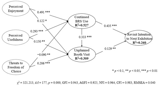 Hypotheses 1a, 2a, and 3a address the structural relationships between perceived enjoyment, perceived usefulness, threats to freedom of choice, and continued BRS use. Perceived enjoyment has a positive effect on continued BRS use (γ11 = 0.491, t-value = 9.613, p < 0.01). Therefore, Hypothesis 1 is supported. Hypothesis 2a is supported by the significant positive impact of perceived usefulness on continued BRS use (γ21 = 0.293, t-value = 5.767, p < 0.01). Hypothesis 3a is supported by the significant negative impact of threats to freedom of choice on continued BRS use (γ31 = −0.090, t-value = −2.513, p < 0.05). Hypotheses 1b, 2b, and 3b address the structural relationships among perceived enjoyment, perceived usefulness, threats to freedom of choice, and unplanned booth visits. Perceived enjoyment has a positive effect on unplanned booth visits (γ12 = 0.122, t-value = 1.803, p < 0.1). Therefore, Hypothesis 2b is supported. Hypothesis 3b is supported by the significant positive impact of perceived usefulness on unplanned booth visits (γ22 = 0.150, t-value = 2.407, p < 0.001). Hypothesis 3b is supported by the significant impact of threats to freedom of choice on unplanned booth visits (γ32 = 0.206, t-value = 4.646, p < 0.01).