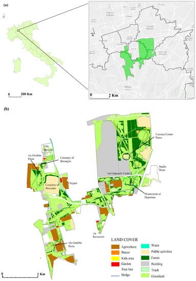 Location of the study area (a) and land use and land cover map of the Parco Nord of Milan (b).