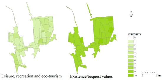 Aesthetic benefits were mainly perceived in correspondence to natural features (forests, lakes, meadows, and tree rows) or architectural features (historical buildings). Aesthetic values addressed a feeling of beauty and other studies have found that they often emerge from diversity in landscapes, from rivers or lakes, from a broad panorama view, or they are mostly related to green spaces that seem “natural” and do not show signs of human construction [25]. Benefits related to artistic inspiration were perceived had low scores. This may be because, compared to other benefits, their perception is dependent to artistic sensitivity that is not as common as other sensibilities or other factors. Spiritual benefits had a low number of scores but were clearly corresponded with religious/spiritual features (the cemetery of Bruzzano, cemetery of Brusuglio and Monumento al Deportato). Bequest values (benefit of the park for future generations) were among the highest values. The park therefore is valued not only for contribution to valued experiences, but also, simultaneously and sometimes inseparably, for its existence, independent of experience [30]. All the respondents defined the perception of this value “for the whole park” without specifying any particular location. The importance of such metaphysical values reflected altruistic, existence motivations values and can be based on virtues, principles, or preferences [30,31].