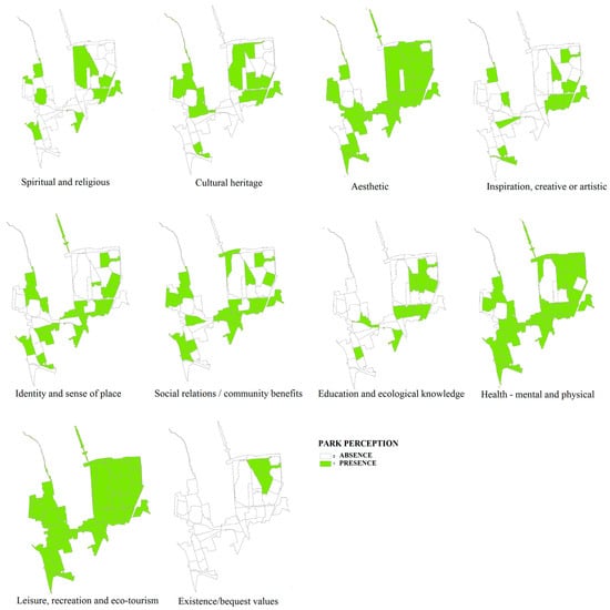 Maps of singular cultural benefits perceived by park management. Colors indicate the presence or absence of benefits perceived.