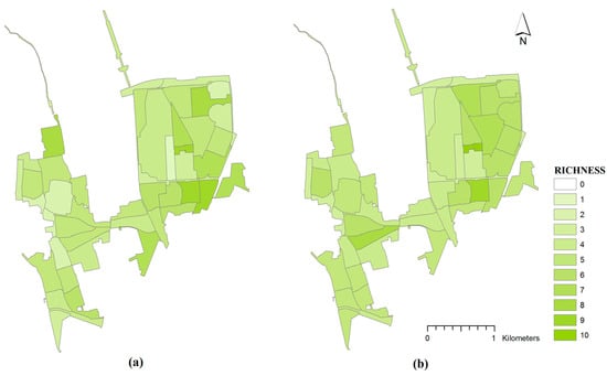 Map of richness (number of perceived benefits) perceived by: citizens (a); and park management (b).
