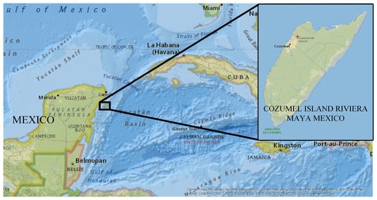 Cozumel Island is located in the Quintana Roo State. It has warm tropical weather throughout the year and is part of the Occidental Caribbean Sea (see Figure 2). With a surface area of 647 km, it had a population of 86,415 inhabitants in 2015 [] with a density of 134 inhabitants per km. It is part of the second largest coral reef in the world, after the great Australian coral reef. Cozumel Island and Quintana Roo State have an average annual temperature of 26 C. The coolest months are December, January and February with temperatures under 22 C. According to the Köppen–Geiger climatic classification modified by García, there are warm, sub-humid climate conditions with intermediate rainfall. A warm, humid climate with abundant rainfall in the summer is found on Cozumel Island [].