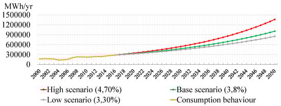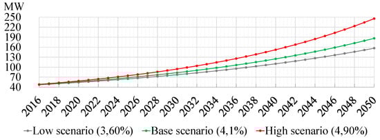 The prospective growth rates for the electricity sector on the Island will be the same as those for the Peninsular region control, as shown in Table 3. According to this growth indicator for the three scenarios, forecasts for power demand and electrical consumption were made. These predictions were made to achieve the targets given in Table 2. The prospective electricity consumption scenarios from 2016 to 2050 on Cozumel Island (see Figure 3) were obtained from the prospective growth rates indicated in Table 3 and from the information specified in Figure 4. The prospective scenarios from 2016 to 2050 on Cozumel Island in power demand (see Figure 5) were obtained from the prospective growth rates indicated in Table 3 and from the information specified in Figure 6.