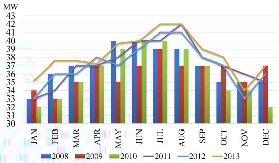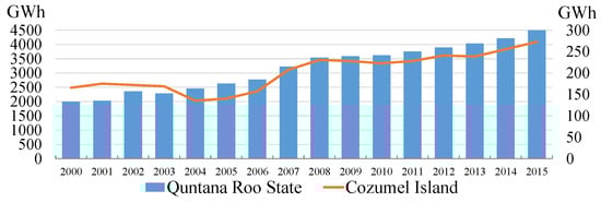 The maximum power demand fluctuates between 41 MW in 2011 and 44 MW in 2014 (see Figure 6). The maximum power generated on the Island covers the electric demand, but sometimes the electricity excess production flows to the main land (Riviera Maya node) []. The electricity consumption on the Island in 2015 was 272.97 GWh, 6.77% higher in regard to 2014 []. Figure 4 indicates the electricity consumption behavior from 2000 to 2015 [,].