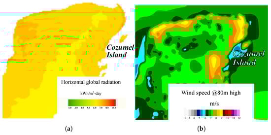 The RE potential in the Yucatan Peninsula and Cozumel Island was obtained from the INERE [] and CONABIO [] Website tool through a Geographic Information System (GIS), from the RES statistical and geographic database. Figure 7a,b show the Horizontal global radiation and the wind speed @80m, respectively, of the RE resources’ potential on the Yucatan Peninsula and Cozumel Island. According to this information of the RE resources’ potential, PV and Wind technologies have been selected to develop this potential on the island.