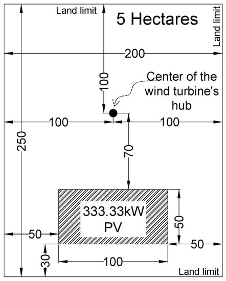 Figure 8 shows a preliminary feasible option for the 5 Ha of land surface: a combination of 2, 2.5 and 3 MW on-shore wind turbines with 333.33 kW of PV. The size has been agreed between owners and local agrarian authorities, taking into account external restrictions such as land used for the production of drinkable water and other agricultural activities. In this land size, and to avoid wind turbulence from the wooded area of the jungle (8–10 m tree high), the minimum distance and the surface roughness length have been considered []. To avoid shadowing, due to the position of the sun on the horizon in the PV panels area, the minimum distance from obstacles or trees has also been considered. Figure 8 represents a basic scheme of the land size available for each PV-Wind combination. It does not mean that this scheme is a restricted surface configuration to be applied.