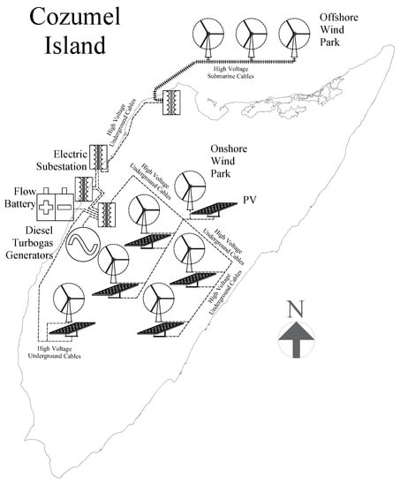 For instance, one of the main objectives in the electricity system in Mexico, as well as in other countries, such as Kazakhstan [], United Arab Emirates [], and in Equatorial Guinea [], is to reduce fossil fuel consumption in its electricity production and to achieve a 50% target in the generation of renewable electricity by 2050. Mexican Islands are not exempt from this target, so this study’s emphasis is placed on a 50-50 target: to reduce the fossil fuel consumption through electricity production from Renewable Energy Sources (RES) to cover 50% of all electricity consumption by 2050 on small islands based on PV, Wind and flow battery technologies. According to the tropical small islands characteristics and using Cozumel Island, Mexico, localized on the Occidental Caribbean Sea, as a case study, this work will analyze the RETs integration into the existing electrical grid. Results will determine the best system for capturing the initial capital cost and competitiveness of this new proposal compared with the current system of electrical production on the Island. Remote or small island communities are particularly vulnerable to climate change impacts, and such regions are often highly dependent on imported fossil fuels to meet their electricity needs [], so it is necessary that the results obtained through this study help those islands to install the right equipment combination to achieve sustainable solutions.