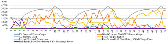 The technology selected for these simulations is indicated in Table 4. The topology and the renewable electrical system of the grid in this study are shown in Figure 9, including the current generation and main transformation system. The equipment selected for these simulations was: Generic PV system; GOLD WIND turbine machines (121/2.5 MW) type IIIB []; WIND to ENERGY turbines (132/3 MW) type IIIA []; SANY wind turbines (SE11520 2 MW) type S []; EWT turbine machines (DW54/250 kW, DW54/500 kw, DW54/900 kW) type IIIB []; and ENERCON wind turbine (E-126 135 7.5 MW) type IA []. These proposed systems have considered the existing diesel turbogas machines and one additional diesel turbogas machine (named: Turbogas Diesel). This new machine will be added only when the power demand exceeds the existing generation capacity, including the 6% reserve margin. The years in which this new diesel turbogas machine will be added are 2021, 2024, 2030, 2035 and 2050. The ideal energy model for the flow batteries was used and the quantity of flow batteries (EnerStore50, from ZBB ENERGY CO. []) in order to achieve 2 hours of backup power was proposed. The Kinetic Battery Model to determine the amount of energy that can be absorbed by or withdrawn from the storage bank each time step [] was used. The AC/DC converter (EnerSection Converter, from ZBB ENERGY CO. []) was dimensioned, considering the 2 hours of backup time from batteries on a full discharge time. This backup time is considered as the time that allows a diesel turbogas machine, starting from a cold point, to supply the electricity needed in that moment, as well as to minimize the fossil fuel generation and to maintain the reliance of the system. As shown in Figure 10, in the first 8 h of 2018 in the Base Scenario, the RES and batteries supply the power demand while the diesel turbogas machine runs. However, between 47 h and 71 h, the fossil fuel generation is imperative, because there is no RE production and the batteries are discharged. It is important to remark that these electrical simulations on the electric grid of Cozumel Island were done in an off-grid mode. This operation allows the system to supply the electricity through fossil fuels for several hours when the renewable sources are not producing and the batteries are discharged. The system runs inversely when batteries are fully charged and renewable sources are producing enough electricity to supply the demand completely. In these two cases, fossil fuels and renewable energy supply the electricity demanded by the system. Because of this, the capacity installed must be much bigger than the power demand, having a 6% reserve margin.