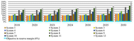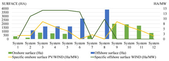 The elements included in each system belong to a series of direct combinations between 333.33 kW in PV with one wind turbine in a 5 Ha surface area for on-shore (see Figure 8), considering the low wind profile resource using wind turbines with a type III-B (GW121-2.5 MW; DW-54/250 kW; DW-54/500 kW; DW-54/900 kW) and S (SE-115/2 MW) power curve. For off-shore, two turbines—type III-A (W2E-3 MW) and I-A (E-126-7.5 MW) power curve—were placed at a separation distance nine times their height in the same prevailing wind direction, and five times their height perpendicular to the direction of the prevailing wind. This was to avoid the presence of a wake effect and the wind production reduction []. Figure 9 shows the proposed topology of the electric grid in combination with the existing equipment on the Island. Only one system (System 12) was selected on the basis of PV, considering a surface area of 1.5 Ha/MW of peak capacity installed. The Figure 11 shows the total land surface affected by 2050 in the Base Scenario, by each of the 12 systems proposed. For instance, System 9 will need 2005 Ha and System 2 will need 175 Ha on-shore and 1140 Ha off-shore.