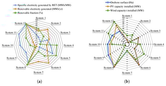 Atlas for RE potential in the Peninsula Area [,]. (a) Renewable Electricity generated and RE fraction; (b) RE capacity installed and on-shore surface used.
