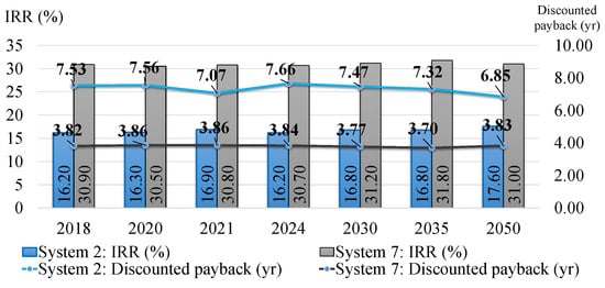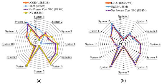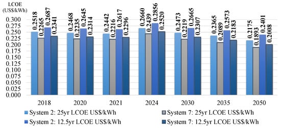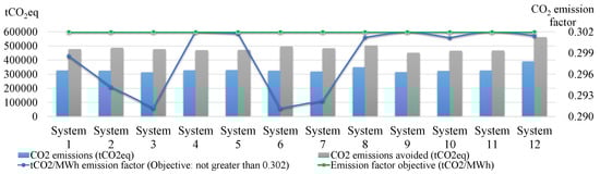 The basic considerations to develop the economic proposal on Cozumel Island (see Table 5) were made based on data from PRODESEN [], PRE [], International Energy Agency (IEA) [,,], Sandia National Laboratories [], and from the Department of Energy (DOE, USA) []. The average diesel cost was obtained from the World Bank Website [] and from PRODESEN. The capital cost of the equipment, O&M, and other economic considerations from the Mexican Government’s report were used in these simulations. The Renewable Energy Certificates’ (CEL is its Spanish acronym) economic inputs were not considered. The results obtained were: the generation capacity of fossil fuels and renewable energy; the electricity generated; the LCOE; the capital cost; the Internal Return Rate (IRR); the payback time, among others. In addition to these results obtained through HOMER®tool, other results were obtained: the surface area used; the CO emissions emitted and avoided; the specific electricity generated by each system; the reserve margin; the targets in contrast to each concept shown in Table 6, inter alia. These results are for the 12 defined systems proposed in this study (see Section 3.4.5). Two lifetime data for the PV and wind technologies have been chosen in the sensitivity parameters: 25 years and 12.5 years. This is due to the risk of a hurricane during the lifetime of the project as indicated at the end of Section 4.3. Wind resource data used in the simulations was compared, obtaining a high similarity with the data obtained from Figueroa-Espinoza and Paulo Salles []. Technical results are included in Section 4.2. Economic results are indicated in Section 4.3. System selection is shown in Section 4.4. After the system selection, analysis of the best system was conducted, as discussed in Section 4.5. Finally, the emission factor reduction results are shown in Section 4.6.