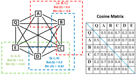 Example: Figure 5 illustrates an example with an estimated task item Q and five selected items—A, B, C, D, and E—as rubrics. For demonstration, the cosine values between these items are generated through a random matrix and are listed in the cosine matrix. The selected optimal rubrics are always a combination of rubrics, not just a single one. In this part, take the combination of three rubrics as an example. If the rubrics are , the relevance .