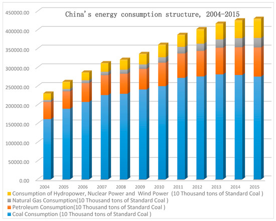 In terms of total energy production and consumption, in 2015, the total energy production of China was 3.62 billion tons of standard coal equivalent (SCE), while the total energy consumption was 4.30 billion tons of SCE—both have more than doubled since 2003. In terms of energy structure, until 2015, coal has remained the primary energy source of China, accounting for about 64% of China’s primary energy consumption, which is 40% higher than the world average (Figure 2) [2].