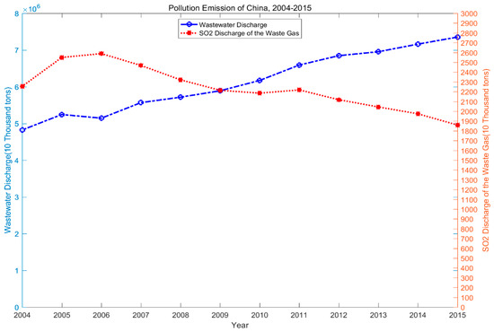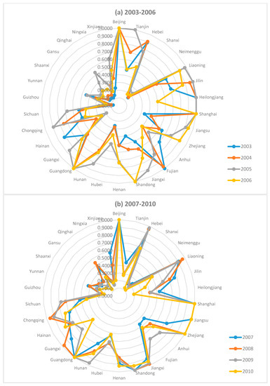 (4) Undesirable Output as an Input Factor: In the case of undesirable outputs, some literature has treated it as Input Factors, which is reasonable under the framework of DEA-SBM Model because the production possibility frontier as a benchmark in the model requires the maximization of output under minimum input. Such as the example of environmental pollution, the maximization of such undesirable outputs would be contrary to common sense. Therefore, we follow the common practice of treating undesirable outputs as input factors in our SBM Model. Similar examples with undesirable output include Reinhard (2000), Färe and Grosskopf (2010), and Chen (2014) [26,27,28]. In our model, we have collected the data of annual emission of waste water and waste gas of different provinces officially published by the National Bureau of Statistics of China as the data for undesirable outputs. Because, from 2011, National Bureau of Statistics of China changed the former data release of total emission of waste gas to the categorized data of emissions of sulfur dioxide, nitrogen oxides, and smoke and dust, this paper used the total emission data from 2003 to 2010; for year 2011 to 2014, we used the total of all three categories of air pollution combined.