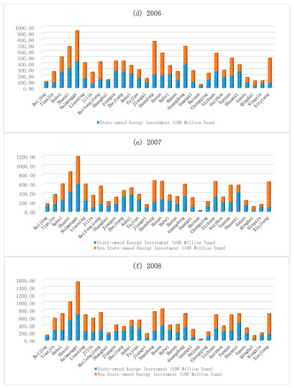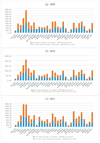 (3) Fixed Assets Investment in Energy Industry by Economies with Different Ownership Structures: To study the impact of ownership structure on China’s TFEE, unlike previous literature, this paper did not choose energy consumption as the input factor of energy. Instead, this study picked the annual fixed asset investment by state-owned and non-state-owned economies in the energy industry across different provinces in Mainland China as the input factor of energy in our SBM Model. According to the statistical standard of the National Bureau of Statistics of China, the state-owned enterprises are controlled by the Chinese central government or local governments (holding more than 50%). The decision-making and behavior of those enterprises are determined by the will and interests of the government. On the other hand, non-state-owned enterprises refer to companies with less than 50% of the government’s holdings. Their decisions are less influenced by the will and interests of the government. Their business goal is to pursue maximum profits. By choosing this indicator, we can directly analyze the different impact of the energy investment by entities with different ownership structures on TFEE. By using the same statistic scope and indicator dimension, we can also compare the difference in the energy efficiency and sustainability of state-owned and non-state-owned economies. Our data of fixed asset investment by state-owned and non-state-owned economies in the energy industry come from the official data released by the National Bureau of Statistics of China.