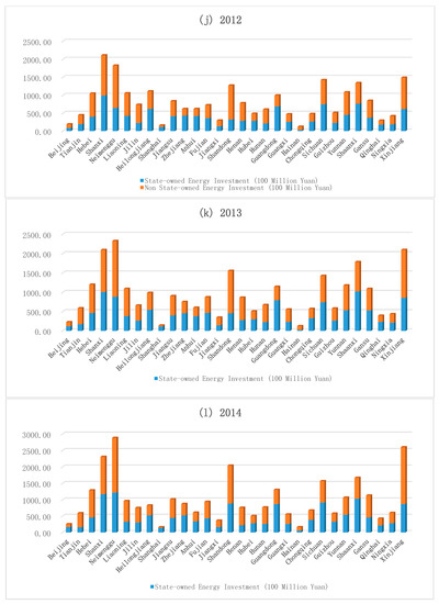 Provincial state-owned and non-state-owned energy investment in the fixed assets of China, 2003–2014: (a–l) Provincial state-owned and non-state-owned energy investment in the fixed assets of China each year during 2003–2014, respectively.