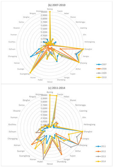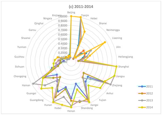 Total factor energy efficiency (TFEE) of provincial state-owned energy investment in China, 2003–2014: (a) TFEE of provincial state-owned energy investment in China, 2003–2006; (b) TFEE of provincial state-owned energy investment in China, 2007–2010; and (c) TFEE of provincial state-owned energy investment in China, 2011–2014.
