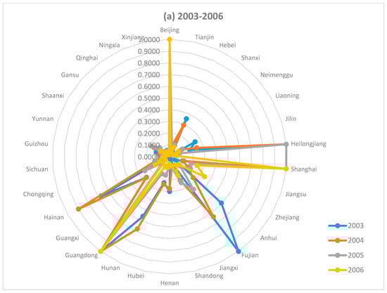 Total Factor Energy Efficiency (TFEE) of provincial non-state-owned energy investment in China, 2003–2014: (a) TFEE of provincial non-state-owned energy investment in China, 2003–2006; (b) TFEE of provincial non-state-owned energy investment in China, 2007–2010; and (c) TFEE of provincial non-state-owned energy investment in China, 2011–2014.