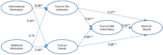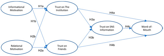 Previous research on communications has validated that the source or content of information has a critical impact on consumers who acquire the information [42]. For example, if hotel visitors are satisfied with and trust hotel services, there is a high likelihood that they will revisit the hotel [43]. Therefore, we hypothesized that trust in institutions and the content of information provided from institutions and, similarly, friends and the content of information provided from friends, will have a positive impact on word-of-mouth for the corresponding information.