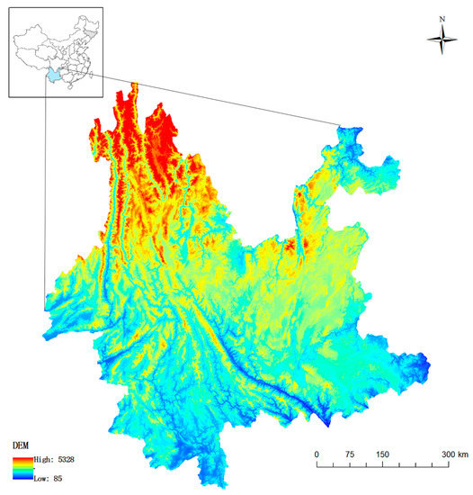 As shown in Figure 1, Yunnan Province (21–30° N, 97–107° E) is located in the southwest of China. The province includes eight cities (Kunming City, Yuxi City, Lijiang City, Lincang City, Baoshan City, Zhaotong City, Qujing City, and Puer City) and eight minority autonomous prefectures (Chuxiong Yi, Diqing Tibetan, Nujiang Lisu, Dali Bai, Dai-Jingpo of Dehong, Wenshan Zhuang and Miao, Xishuangbanna Dai, and Honghe Hani and Yi Autonomous Prefecture). The total area of Yunnan is 394,000 square kilometers, which accounts for 4.11% of the entire area of China. The population in Yunnan in 2010 reached 49.65 million people (3.35% of the population of China). In recent decades, Yunnan province has developed rapidly, forming a double-center economic growth model, involving Kunming City and Yuxi City.