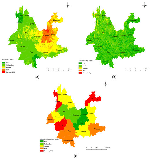 We assessed the three components of agricultural drought vulnerability based on the pixel scale. The pattern of the exposure index is shown in Figure 2a. Exposure values showed the trend of vulnerability reduced gradually from east to west. Extremely high exposure regions (0.8 < EI < 1) were concentrated in Kunming City, which has a high proportion of cultivated land and a large population. High exposure regions (0.6 < EI < 0.8) were concentrated in Zhaotong City and Qujing City. Exposure values were high in relation to the high population density, low rainfall, and the areas with few farm crops sown in these regions. Medium regions (0.4 < EI < 0.6) showed a trend of transition to connect the highest and lowest areas. Medium low regions (0.2 < EI < 0.4)) and low exposure regions occurred in Northwest and Southwest Yunnan Province; especially in the northwest, the EI was at a bare minimum (0 < EI < 0.2). Low population density in rural areas caused low industrial demand for agriculture. The ratio of tillable land was a small proportion of all the farmland, and the areas planted accounted for an accordingly small amount.