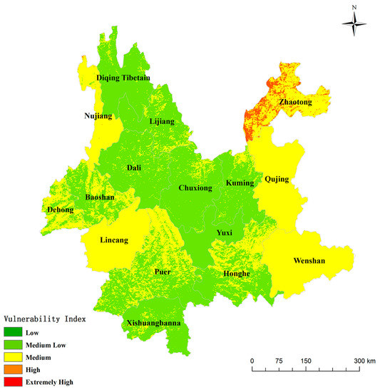 To reflect the pattern of the agricultural drought vulnerability and improve the comparability with other regions, we adopted a fixed classification of index values for classifying the composite index into five classes. The agricultural drought vulnerability of Yunnan Province could be divided into five parts: low vulnerable (0–0.2), medium low vulnerable (0.2–0.4), medium vulnerable (0.4–0.6), high vulnerable (0.6–0.8), and extremely vulnerable (0.8–1.0), and the regions were divided correspondingly.