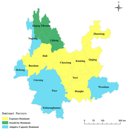 Exposure-dominant regions were concentrated in Middle and Northeast Yunnan (including Zhaotong City, Kunming City, Qujing City, Yuxi City, and Honghe Hani, Chuxiong Yi Autonomous Prefecture, Dali Bai Autonomous Prefecture and Baoshan City), where population density agglomeration and the land cultivation ratio were high. Sensitivity-dominant regions were distributed in Northwest Yunnan (including Diqing Tibetan Autonomous Prefecture and Lijiang City). The northwest area was characterized by rugged topography and little forest coverage. Adaptive dominant regions were distributed widely; in other words, agricultural drought vulnerabilities of most remote regions in Yunnan were short of adaptive capacity. Nujiang Lisu Autonomous Prefecture had the lowest per capita farmer income and irrigation level, thus, adaptivity was its dominant factor.