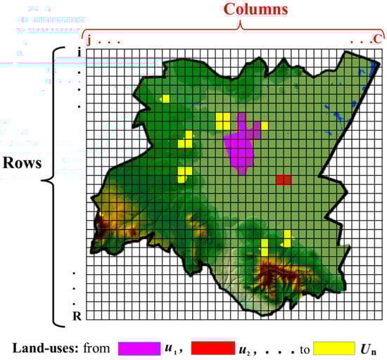 The following multi-objective optimization problem aims to provide a sustainable territorial exploitation at the sub-region scale considering economic, environmental and social aspects and an annual time scale. For land use allocation, the territorial discretization into homogeneous cells (Figure 1) according to the detail of available spatial data in raster format has been adopted. Each cell is a square portion of the territory with a single land use. Territory spatial features are analyzed in each grid cell.
