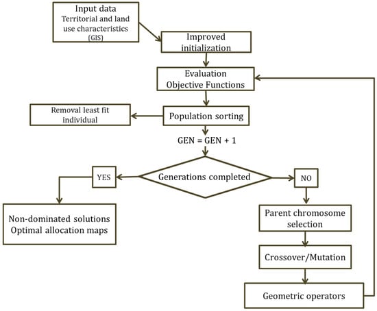 The model for sustainable land use allocation known as MAUSS (Spanish acronym for “Modelo de Asignación de Uso Sostenible de Suelo”) solves the multi-objective optimization problem described above. MAUSS incorporates the multi-objective genetic algorithm NSGA II [], which has been substantially modified to fit the spatial planning problem stated previously as shown below. A flow chart of the model is shown in Figure 2.