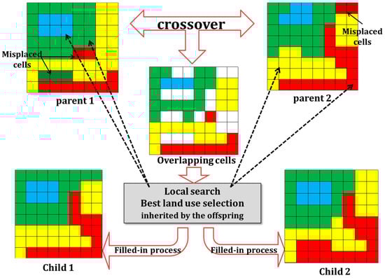 - Overlapping stage: Cells of parent one and parent two in whose positions land use type is equal (overlapped cells) are inherited by child one and child two provided they are located within their valid subsets. Matching cells containing different land uses remain empty.