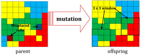 Mutation operator. This genetic operator aims to relocate land use cells outside their valid subset and therefore diversity among individuals with a mutation probability of 10%, mutation performs as indicated below (Figure 3):