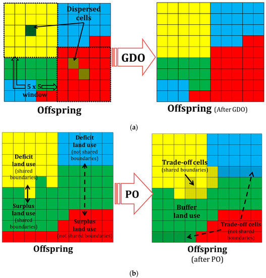 - The geographic dispersion operator (GDO) was designed to enhance the compactness of patches. The GDO identifies land use cells allocated either within or outside their feasible subset in a 5 × 5-analysis cell window spread (Figure 4a). Once identified, they turn into the most frequent land use of the neighboring cells. Geographic dispersion must be defined for each implementation of the model because it depends on both geographic extent and cell size, and is related to the specific spatial optimization targets and the available local cartography. In this work, dispersion is understood in the analysis window as one or two maximum adjacent cells whose land use type differs from the remaining neighboring cells. The process iterates until there are no more spread cells in the grid.