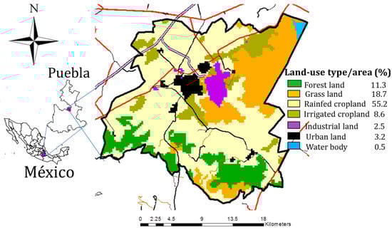 The Plains of San Juan are located in the center of Puebla state (central Mexico) between 19°10′38′′N to 19°16′41′′N latitudes and 97°55′85′′W to 97°37′79′′W longitudes (Figure 6). The area occupies a sub-region of some 500 km2 within the plains, which is undergoing a rapid industrialization process led by the automotive sector. Five municipalities comprise the area, which has 63,770 inhabitants [] settled in three small urban centers and several rural communities whose overriding productive activity is primary production for self-consumption and local trade. Nonetheless, in the last three years, urban and industrial expansion has spread without effective regulations and most of the significant land use changes have taken place in the sub-region without an official land use plan.