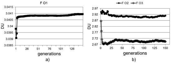 Figure 7 shows the performance of each objective function with average values over the generations. Substantial improvements were achieved in the first ten iterations in each objective until the values became stable. The evolutionary process improved all values of the initial set of chromosomes.