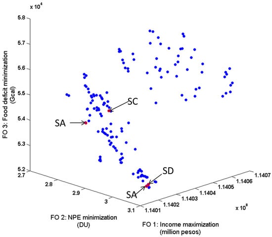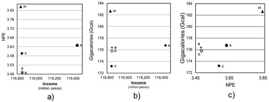 Objective function values of scenarios SA, SB, SC, SD (Non-dominated set of solutions) vs. scenario 01 (official proposal): (a) income versus negative pressure on the environment (NPE); (b) income versus food surplus in Gigacalories (Gcal); and (c) negative pressure on the environment (NPE) versus food surplus.
