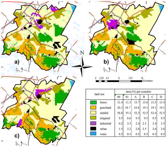 The results are presented in several scenarios to clarify the huge territorial transformations ongoing and the land use allocation improvements using the MAUSS model: Scenario 00 (S00), land use distribution before the industrial expansion of automotive sector; Scenario 01 (S01), current land use allocation (official proposal) and Optimal Scenarios (A, B, C and D), defined by both the solutions selected from the non-dominated set of solutions after the evolutionary process. The definition of optimal scenarios is based on both the level of accomplishment of the objective functions: the best solutions for functions O1 (scenario A [SA]), O2 (scenario B [SB]), O3 (scenario C [SC]) and the trade-off solution (scenario D [SD]); and the most suitable land-use distribution. The fixed values of the cells not considered in the evolutionary process due to the restrictions explained above were added to the results of evolved solutions in order to establish comparable scenarios. Due to the nature of the spatial planning problem, a simple criterion to select scenarios has been considered instead of more sophisticated procedures like the knee method [,]. MAUSS aims to provide reference solutions to set the study region within the non-dominated set of solutions and aid spatial planners in decision-making processes, which are strongly affected by other factors (e.g., cadastral borders and land ownership) that cannot be incorporated in the mathematical approach of the problem.