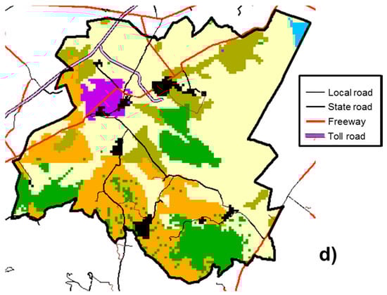 Equation (4) is the second summand in function O2 and estimates the production of CO2 equivalent at cell scale based on national and local statistics and corporations’ public reports. It is expressed as a fraction of CO2 equivalent tons for surface unit (cell) with land use u over the maximal emission level in the study area. For urban and industrial land uses, the function establishes that the more spread in a territory and the farther from communication links they are located, the higher the CO2 emissions due to the usage of fossil fuel for the transportation of people and goods []. Additionally, when the land use in cell ij changes from forestry use to any other type of use (net loss of forest), CO2 emissions generated by land use change are weighted by factor , which depends on the allocated land use rather than the existing forestlands, thus favoring their maintenance.