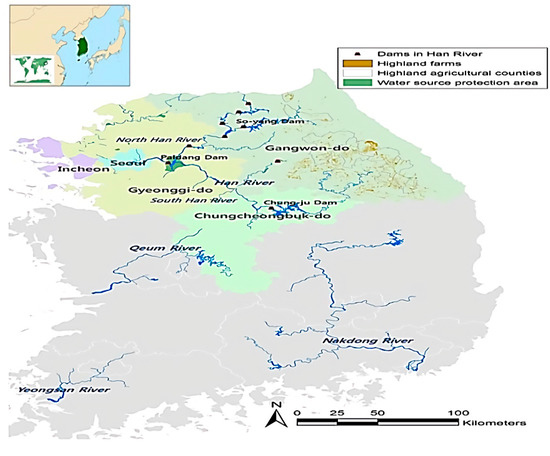 The Han River basin lies on Seoul and Incheon (downstream), Gyeonggi-do (midstream), and Gangwon-do and Chungcheongbuk-do (upstream) (Figure 1). The area and human population of the basin are 24,988 and around 20.4 million, respectively. The upstream areas have the highest proportion of the area (65.6%, 16,398 ), followed by the mid- (31.6%, 7886 ) and the downstream areas (2.8%, 704 ). On the contrary, the downstream areas have the highest proportion of the population (56.6%, around 11.5 million), followed by the mid- (36.6%, around 7.5 million) and the upstream areas (6.9%, 1.4 million). The highland area for vegetable production in the basin which leads to the high soil erosion as a prime cause of the contaminated turbid water problem is 2753 . Around 61.8% (1702 ) of the vegetable areas belong to the upstream areas. The water source protection zones in the basin correspond to 191.3 and are predominated around the Paldang Lake in the midstream area (78.2%) [8,12].