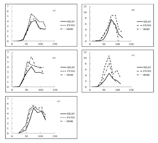 Interpolation of Leaf Area Index (LAI) sown: (a) Early (2012); (b) Medium (2012); (c) Late (2012); (d) Early (2013); and (e) Medium (2013). X axis: days after sowing (DAS); Y axis: LAI.