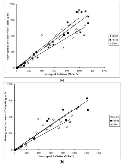 (a) The relationship between intercepted radiation and above-ground dry matter (DM) yield in 2012. (b) The relationship between intercepted radiation and above-ground DM yield in 2013.