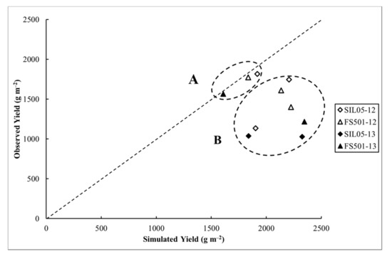 Comparison between simulated and observed yield: (A) the plots where the simulated yield was close to the observed yield; and (B) the plots where the simulated yield was higher than the observed yield.