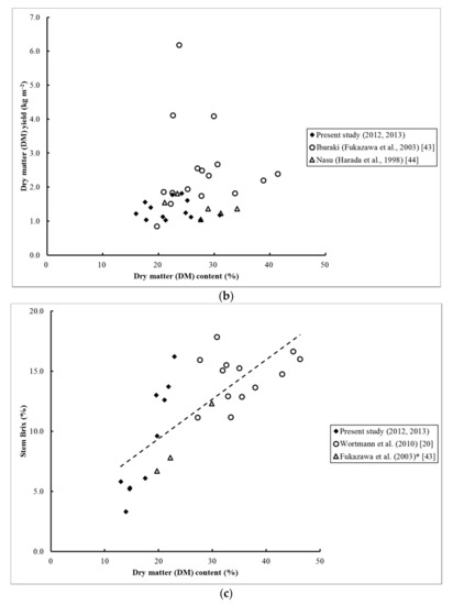 As mentioned in the Introduction, Inuyama et al. [27] obtained stem weights of sorghum in the range of 3.37–4.48 kg m−2 on a fresh matter basis. These values are comparable to the lower range of the values obtained in the present study, i.e., 3.35–7.56 kg m−2. To compare yield levels obtained in the present study in terms of those reported by other workers, DM yield was plotted against DM content (Figure 5a,b) [20,43,44]. Compared on a DM basis, yields obtained in the present study were relatively lower than those reported by Wortmann et al. [20] (Figure 5a) and Fukazawa et al. (Figure 5b) [43], while they were comparable to those reported by Harada et al. (Figure 5b) [44]. High values of DM content reported by Wortmann et al. [20] and Fukazawa et al. [43] appeared to explain at least partly the differences in DM yield between their studies and the present study (Figure 5a). As to stem brix, Kamiyama et al. [45] observed values in the range of 13.7% to 16.2% for three cultivars in Ibaraki prefecture, while stem brix in the present study and especially of FS501 was generally lower. Kawahigashi et al. [46] reported brix values ranging from 2.8% to 19.6% for 109 sorghum accessions where SIL05 showed a value as high as 19.4% compared to the range of 5.3% to 16.2% observed in the present study for the same cultivar. When plotted against DM content, stem brix was positively correlated to DM content (Figure 5c) [20,43], which was in accordance with Table 6.