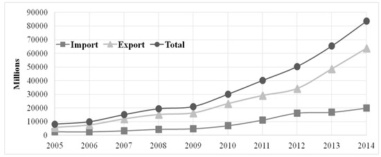 China is expected to face some competition with Vietnam, which is considered by many scholars to be an important competitor to China. The relationship between China and Vietnam has been delicate since ancient times. During and even after the Cold War, as national interests diverged, and due to political asymmetry, many neighboring countries felt an implicit threat from China, and Vietnam is the archetypal example of such a fearful neighbor [11]. As historic enmity and suspicions between the two countries simmered, Vietnam has been taking dynamic “soft balancing” as a response to the rising China [12]. In recent years, in the South China Sea, the two countries have had frequent conflicts, and this in turn has altered their geo-economic relations. The trade competition between Vietnam and China has also begun to be intensified. In this study, we focus specifically on the textile, apparel and clothing, and footwear instead of all the industries, because there is competition and cooperation in these three industries between Vietnam and China. China and Vietnam are both populous countries, and labor-intensive industries developed rapidly due to their abundant labor resources. Some products of labor-intensive industries, like textile, apparel and clothing, and footwear, are competitive in the international market. The export target market for these three products is mainly concentrated in developed countries, such as the US, Japan and Australia. Once Vietnam starts to enjoy more favorable open-market access conditions in the textile and apparel markets, will China still be able to maintain its current key market share in textile and apparel export markets, such as the US and Japanese markets? Furthermore, as has been mentioned before, Vietnam’s trade has been closely linked to China in the most recent decade (Figure 1). China is currently one of the leading suppliers of textiles to Vietnam and other Asia-Pacific countries. Thus, the increased import demand for textiles from Vietnam and other Asian countries might create additional export opportunities for China after the implementation of a new trade agreement [13].
