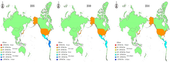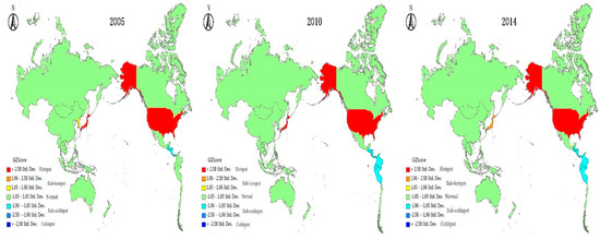 Figure 2 shows the results of the hotspot analysis of geo-economic relations between China and Asia-Pacific countries from 2005 to 2014 (Equations (4) and (5)). Hotspots are mainly concentrated in the United States and Japan, which both have a close and complementary relationship with China in terms of trade. By virtue of their nearby location, North Korea and South Korea both belonged to the hotspot area in 2005. In 2010 and 2014, however, both countries were no longer hotspots. Coldspots are mainly concentrated in the Caribbean and in northern South America. This is expected, because these countries are all a great distance from China, and trade with them is smaller compared to the key market countries.